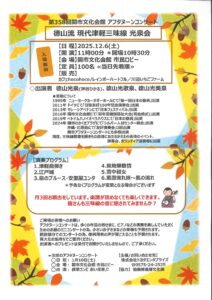 | 現在、三味線教室を開きその指導にあたるかたわら各地のイベント、演奏会、ボランティア演奏等に出演 |